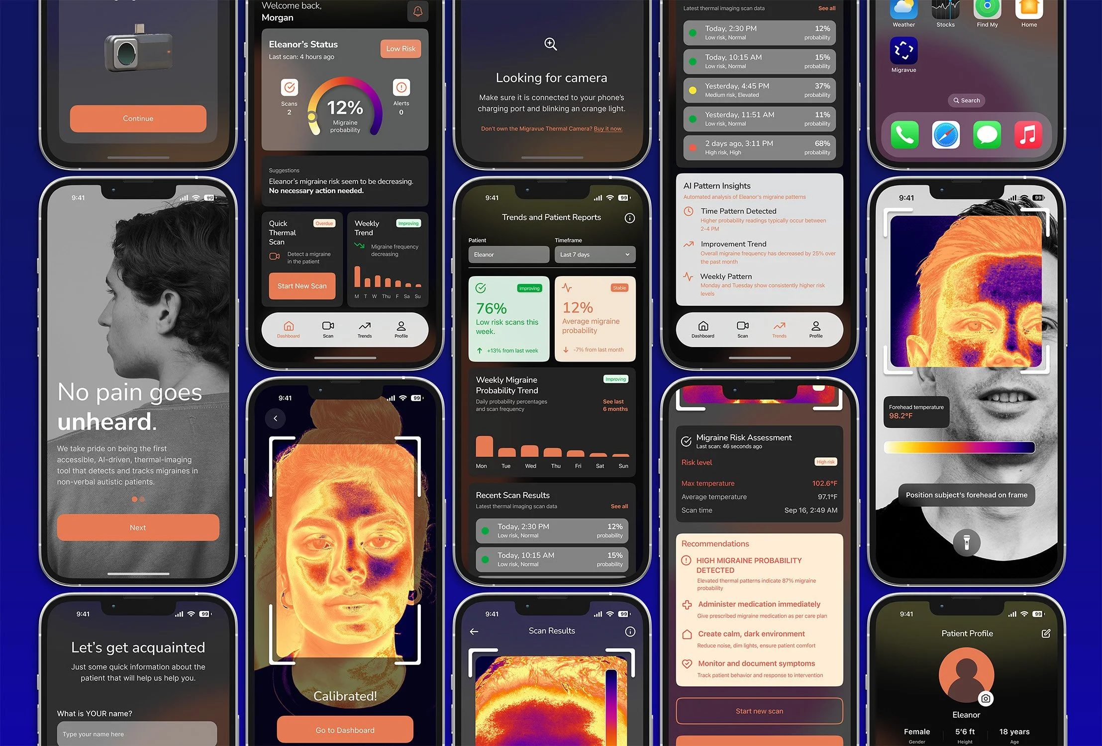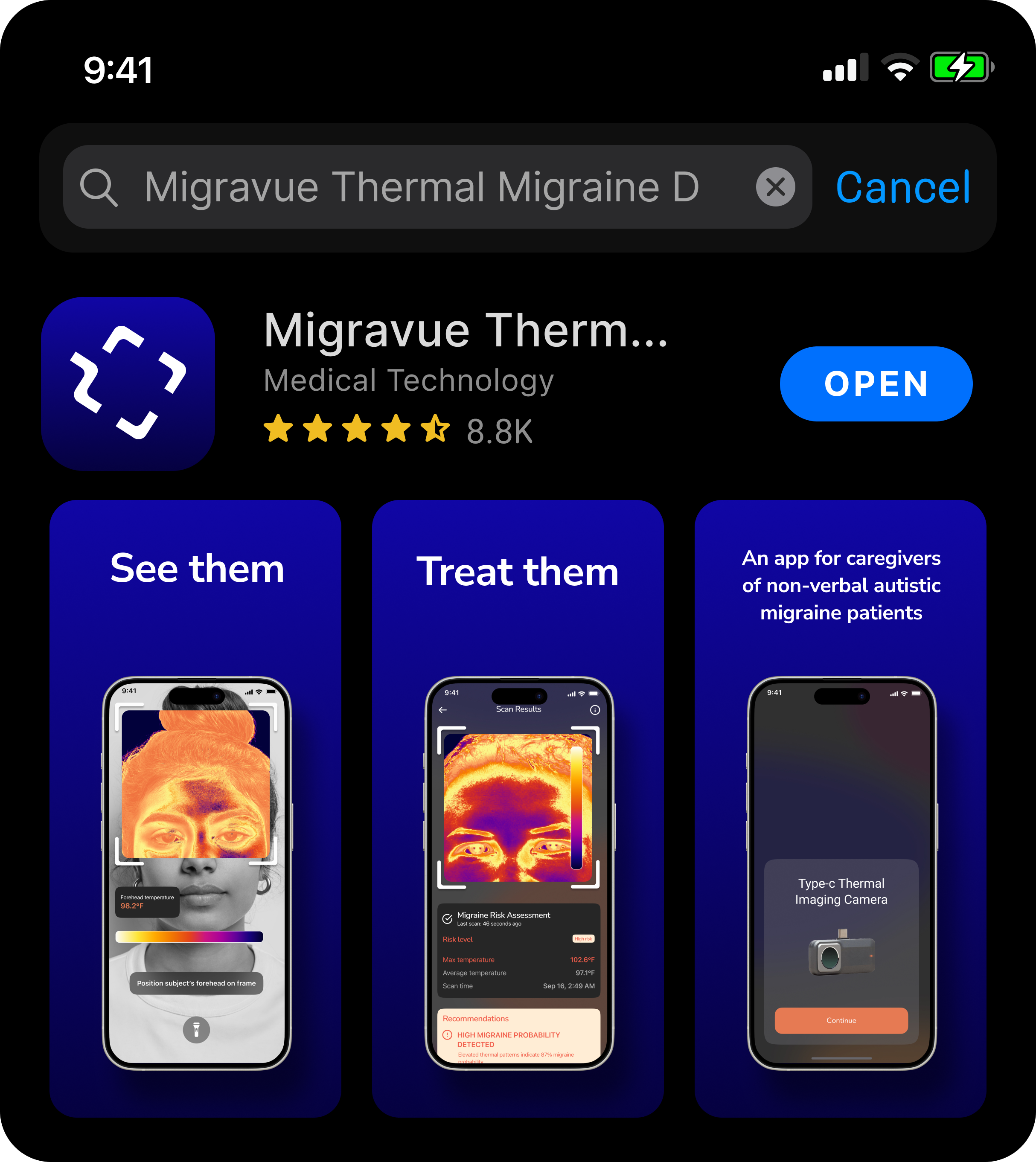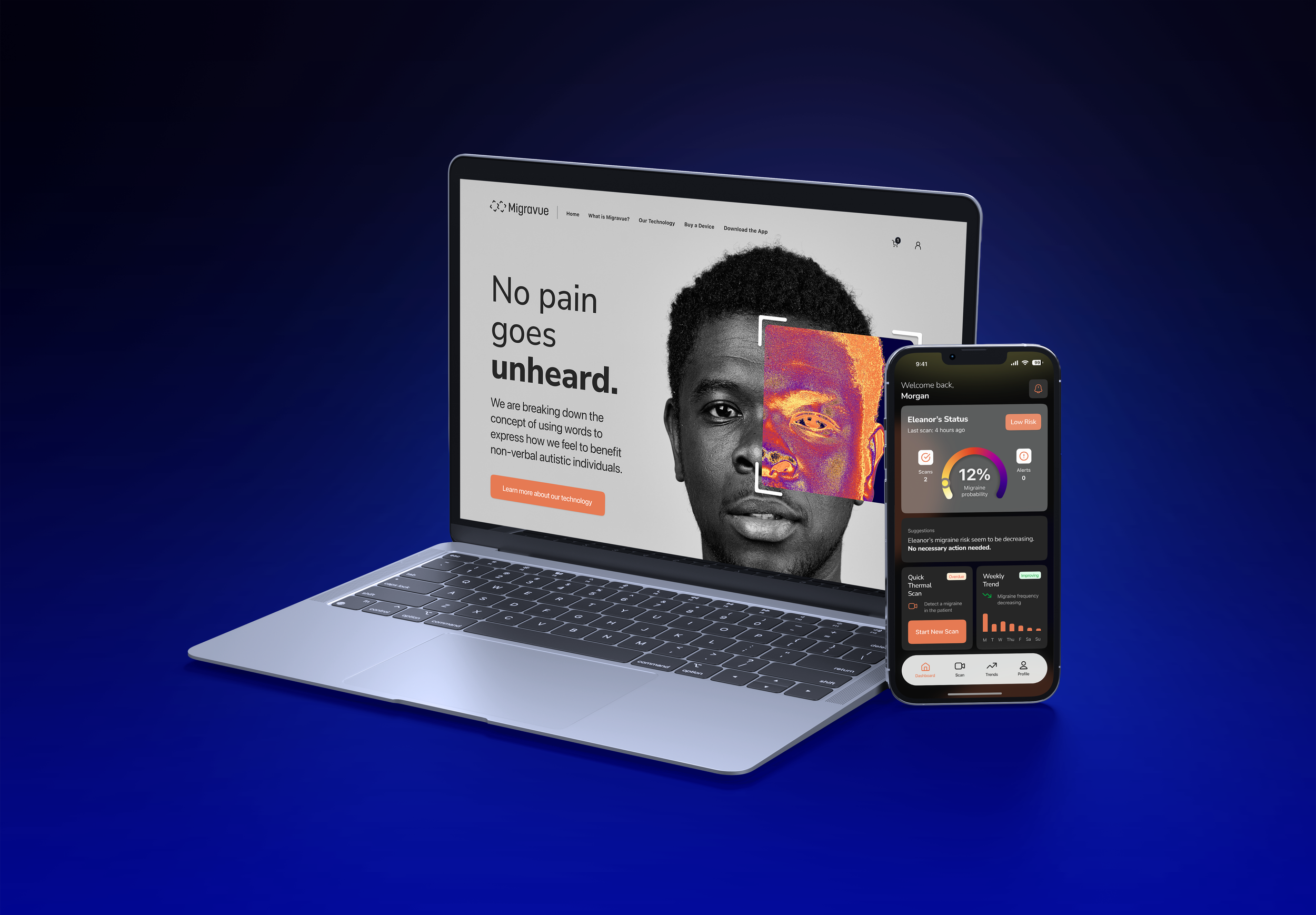 Migravue is a migraine-measurement app that uses thermal imaging to detect heat patterns on the surface of the head associated with migraine activity. The app provides an objective way to identify and locate pain in non-verbal autistic individuals, allowing caregivers and medical professionals to recognize symptoms earlier and make informed treatment decisions for patients whose pain is often unnoticed.